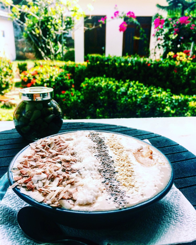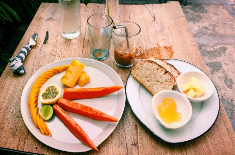 The surf camp is pretty remote from the hubbub of the towns nearby and so quiet. It is located near Green Bowl – a good surfing spot. There are a few pet dogs roaming around and two puppies: Bear and Freckles. There’s a pool, outdoor shower, rec room with a pool table, 3 or 4 places to lounge on beanbag chairs, hammocks, sun chairs, or couches. The kitchen area is awesome with community style tables with long benches and the food is cooked by a native Balinese man-Kadek. There’s also a masseuse who gives 60 minute massages for $10. Breakfast is free every day and dinner is provided 5x a week. There’s a menu of things to pick from for breakfast and also a lunch and drinks menu. Breakfast was great with fresh fruit yogurt and granola, a poached egg, and a banana pancake.