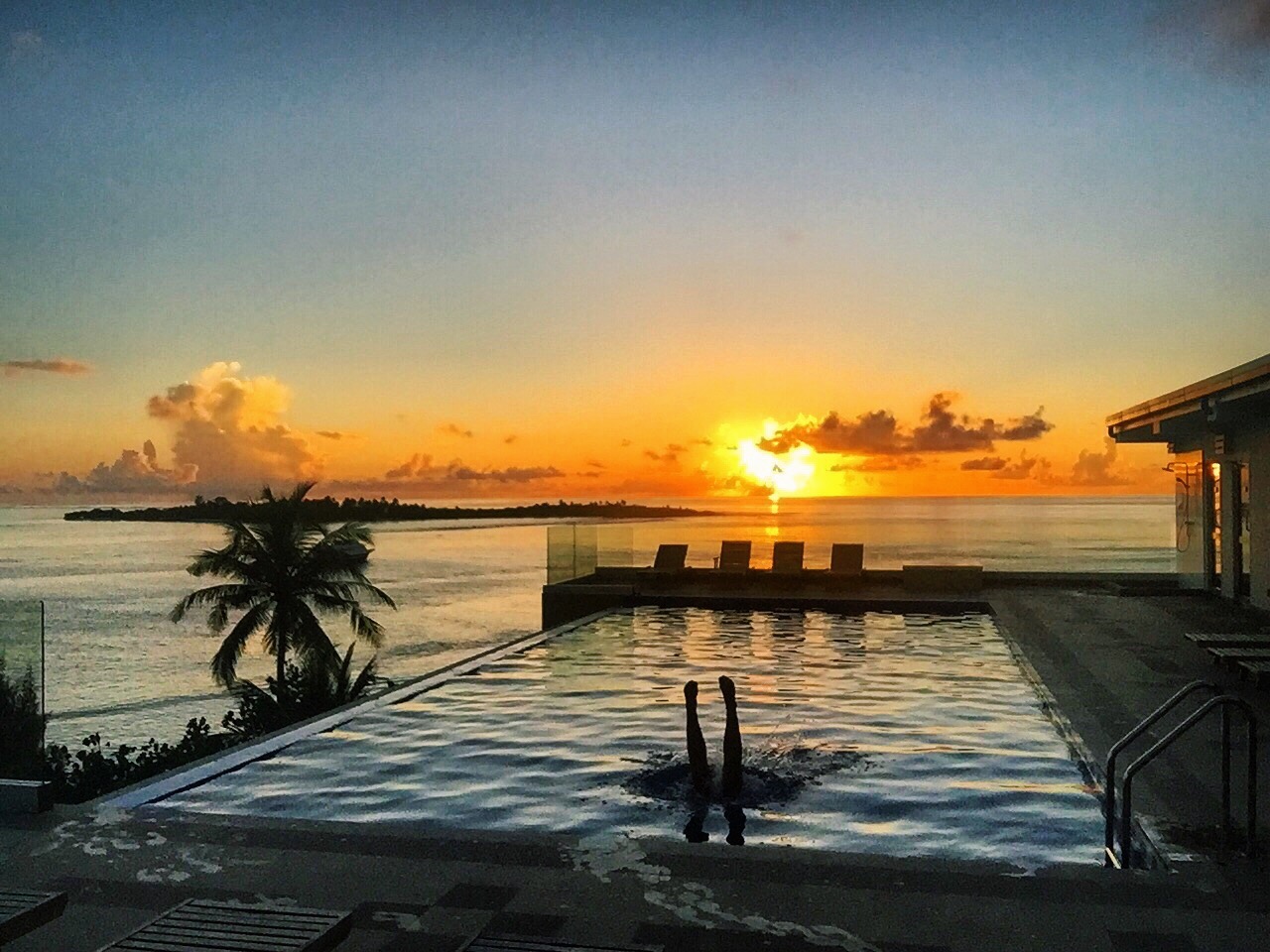 We surfed for about 3 hours there and I caught one good wave and a handful of short rides. Paddling back in was a battle as there was a small area between the rocks and reef but the current was going out so not much of an area to work with again. Juon told me to paddle to the left and I got nowhere so our other surf guide said to the right and then I went too far and again struggled coming in. Well known for my struggles now. We had a bite to eat and then hopped in the car and headed back to Honeymoon. The guys went out to check and ended up being flat so we decided to head to Torra Torra and see what the guys driving the boats thought. It was super packed out at the break so we decided to just have an easy afternoon on the beach and get some drinks. Then we went back to the camp and all went for a swim. We had scheduled a yoga session as we didn’t have our second surf session. Tim and Dominic, Direk, Rene, and Karolina a lady from Poland all came. Our instructor was from Russia and was awesome. We had an hour and a half and it was the guys first yoga class. We were all sweating like crazy even though it was getting dark and there was a breeze. The guys didn’t realize how hard it was and were struggling a bit but we all had fun- one of the best yoga classes yet! We went for a quick swim, showered, and had dinner. Then we decided to have a pool tournament with 6 teams. Rene and I were partners and he’s probably the best guy or girl here so we won! Then we had a second tournament and Rene and I were in the finals but lost to Ahmed and another girl. Off to bed we went – by 11 as we had the early surf session the next morning- 5:30 am bright and early.